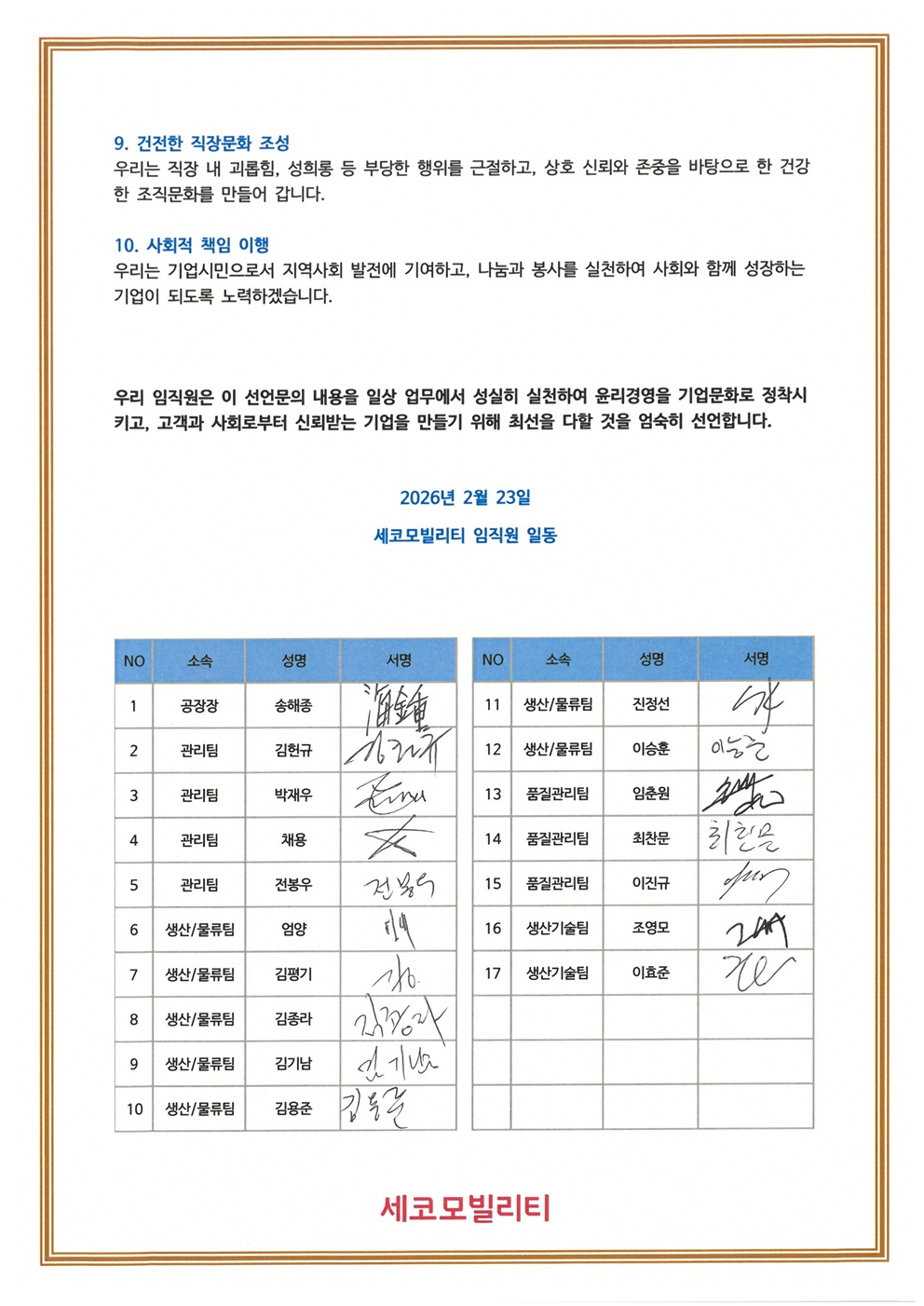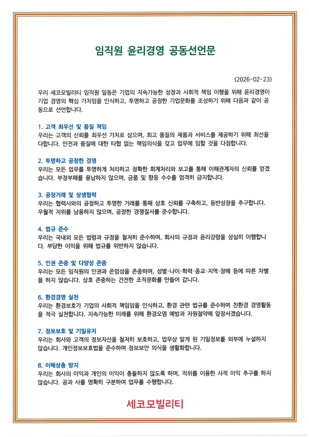 세코모빌리티 임직원 윤리경영 공동선언(2026년 2월 23일)이 있었습니다.